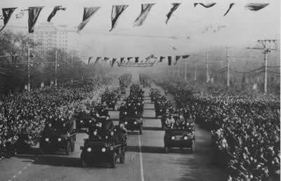 1966年8月18日毛泽东佩戴红卫兵袖章,在北京城楼首次检阅红卫兵。