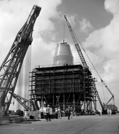 1960年9月6日,独特的圆顶舰岛吊装