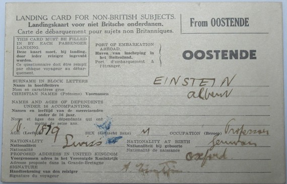 爱因斯坦经比利时逃到英国,入境时被要求填写入境登记卡。在卡上可以看出,在1933年5月26日,爱因斯坦放弃了德国国籍,改称自己为瑞士公民。