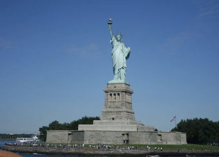 在美国纽约市哈德孙河口的贝德罗岛上,矗立着一尊高大的铜像,面对着大西洋。它就是著名的『自由女神』像。这尊铜像的选型,是按照希腊神话中女神的美丽形象建造的。女神头上戴着额箍,右手高举火炬,左手拿着《独立宣言》面容端庄而慈祥。女神像高46.5米,连同它的基座有93米高。女神像是用2.4厘米厚的铜板一部分一部分铸成的。基座底部是一个博物馆,参观的人可以进到铜像里面直到女神头部顶端,那儿可以容纳30多人,能通过玻璃窗俯视纽约的全景。