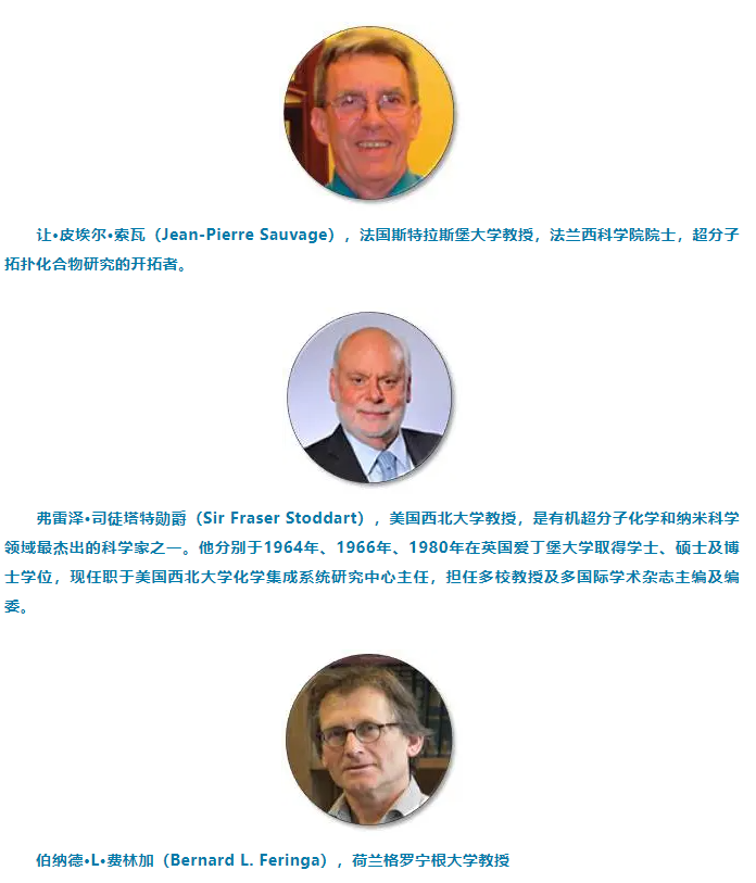 J·弗雷泽·斯托达特(SirJ.FraserStoddart)是英国合成分子化学家,1942年出生于爱丁堡,现任美国西北大学教授,他的研究专长为分子纳米技术及均相催化。伯纳德·L·费林加(BernardL.Feringa)是荷兰合成有机化学家,出生于1951年,他于1978年在荷兰格林罗根大学取得博士学位,现任格林罗根大学化学系教授、荷兰科学院副院长。