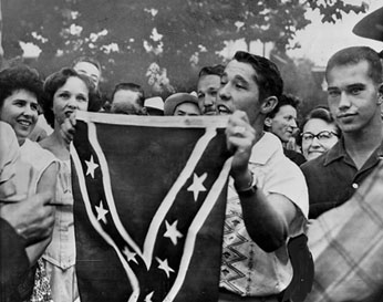 手持南部联邦旗帜的白人青年在校门口阻止黑人学生入学