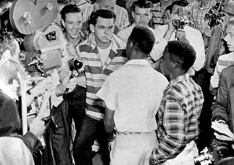 一名白人青年试图阻止两名黑人青年进入小石城高中