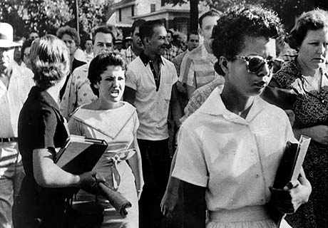 9名黑人学生在严密保护下拿课本走进学校,白人学生怒目而视